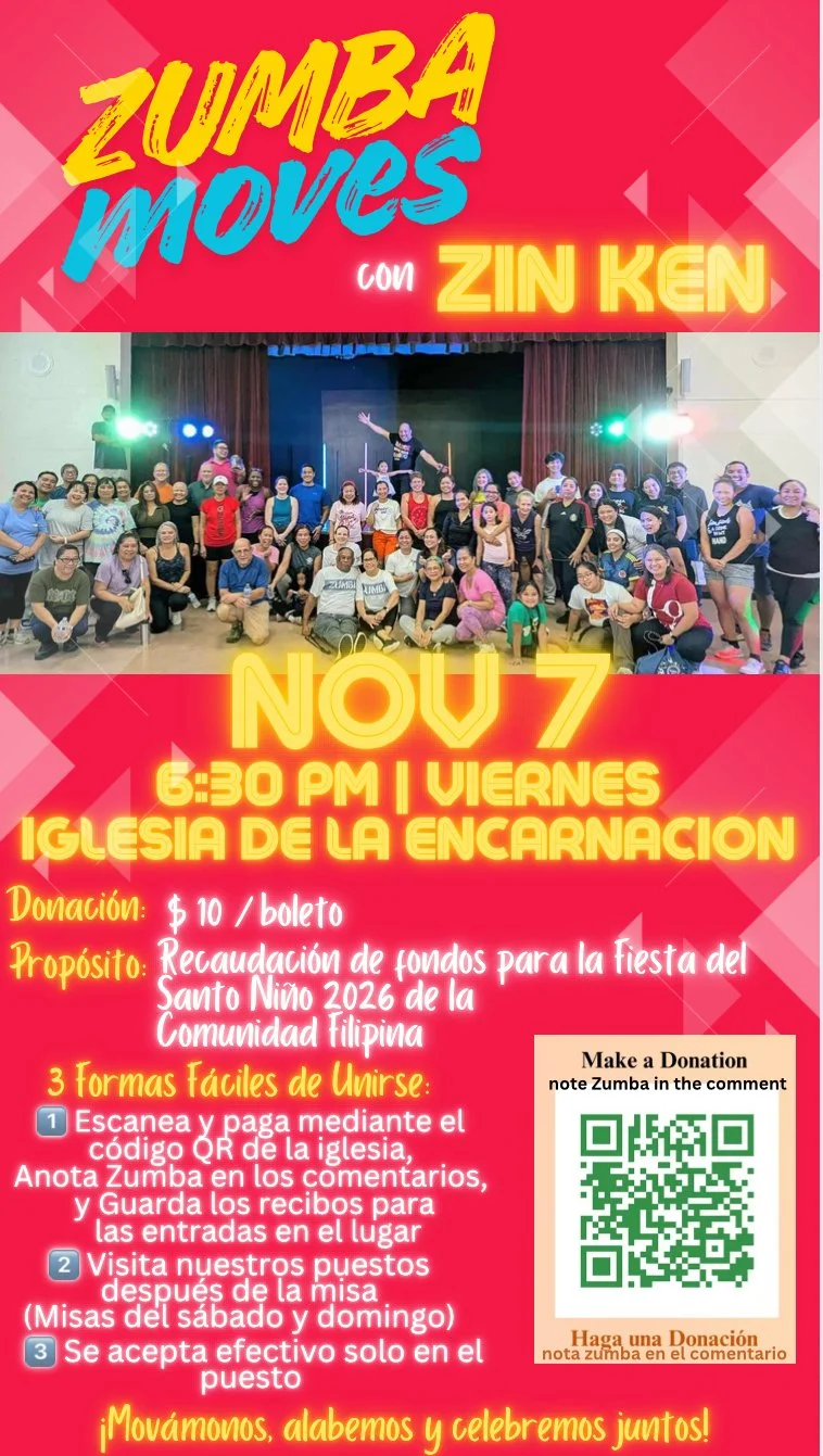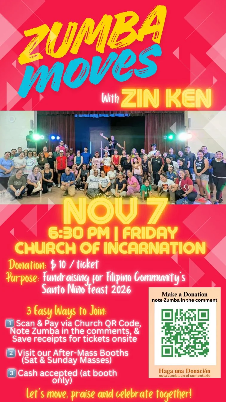 FILIPINO ZUMBA EVENT: The Santo Niño Group of the Filipino Community invites everyone to join another Zumba Fundraiser for the Santo Niño Fiesta 2026. Zumba Event will be on Friday Nov 7, at 6:30 at the Church of Incarnation. Doors open at 6:00pm for registration and tickets. Tickets are only $10 each. They can Scan Church QR code on the posters to make payment online. They have to Note ZUMBA on the comment. They will receive a confirmation number and receipt— simply show this to claim ticket at the door. Tickets can so be claimed after the weekend masses at the booth outside. All proceeds go towards the Santo Niño Fiesta 2026 Celebration this coming January.
